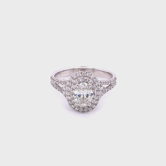 Stunning double-halo diamond engagement ring set in 18K white gold and featuring a beautiful 0.73CT size oval diamond.